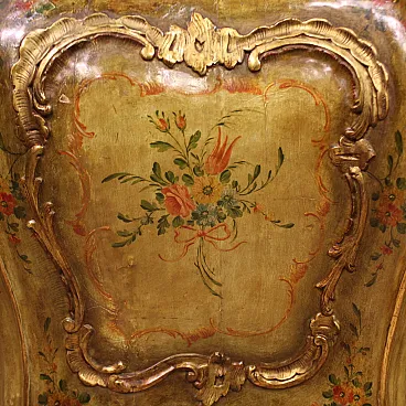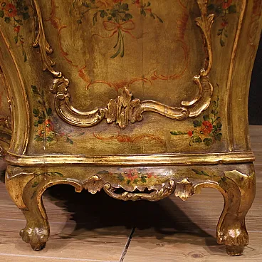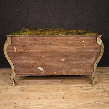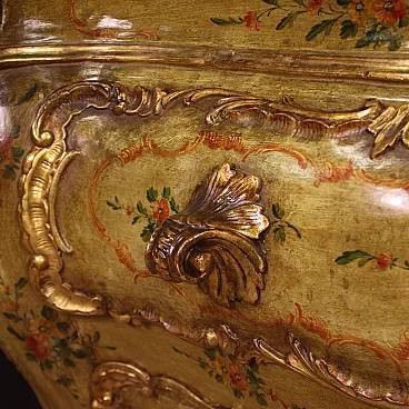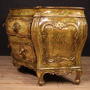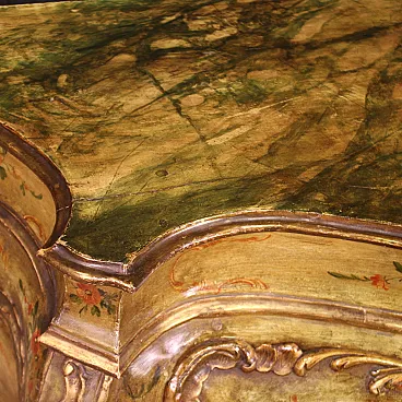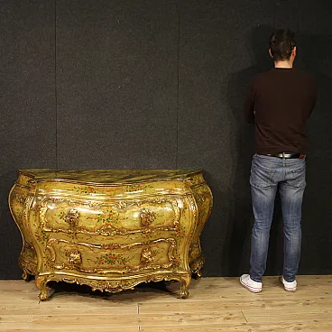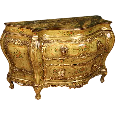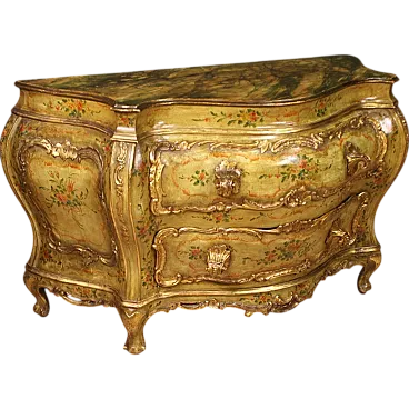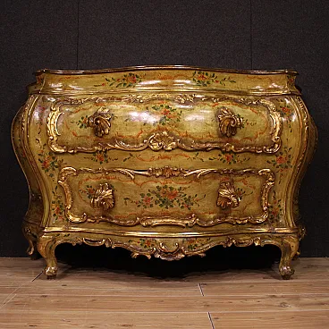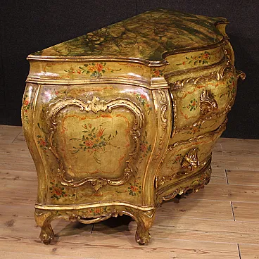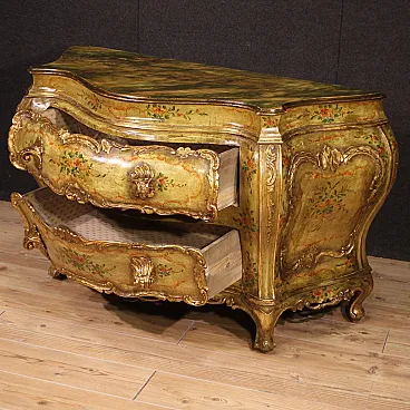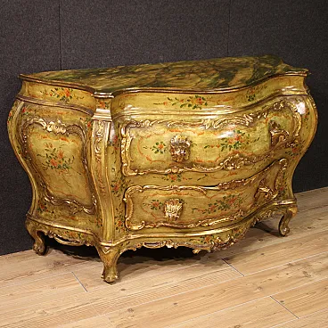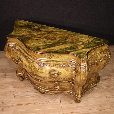 Scenografico cassettone italiano della metà del XX secolo. Mobile in legno riccamente intagliato, laccato e dorato a motivi floreali in stile veneziano, di grande piacevolezza. Comò munito di due cassetti di ottima capacità e servizio. Piano superiore dipinto a finto marmo di bella decorazione, con alcuni segni del tempo (vedi foto). Mobile di notevoli dimensioni e grande impatto, ideale per un salone di rappresentanza o camera da letto. Presenta alcune piccole cadute di colore, nel complesso in buono stato conservativo.