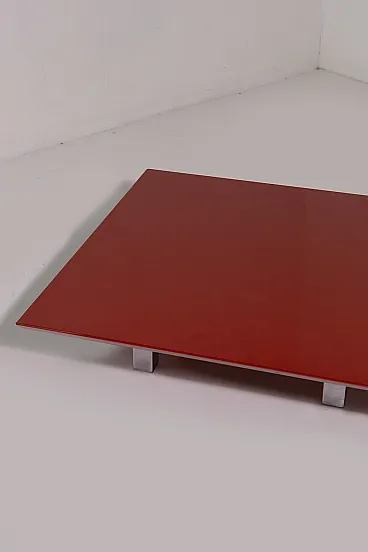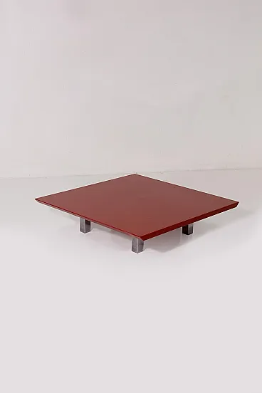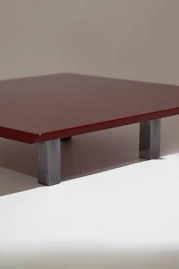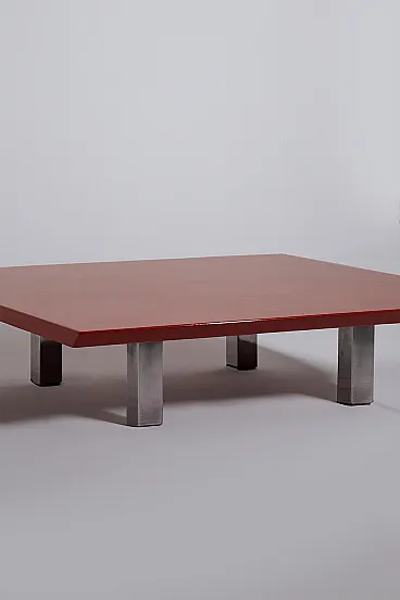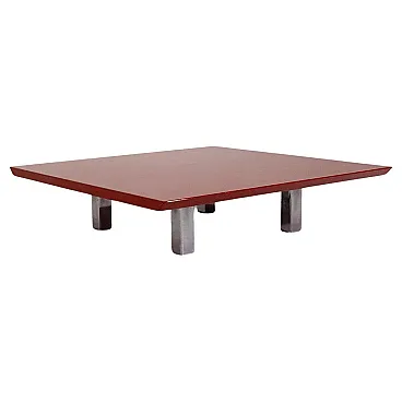 Questo elegante tavolino basso, disegnato da Vittorio Introini negli anni '70 per la rinomata casa di produzione Saporiti, è un perfetto esempio di design minimalista e ricercato. Il piano, in legno laccato rosso lucido, cattura subito l'attenzione con la sua impeccabile e vibrante finitura, aggiungendo un tocco contemporaneo ed esclusivo. La superficie liscia riflette magnificamente la luce, portando un senso di energia e raffinatezza a qualsiasi spazio che adorna. Le gambe in metallo cromato, con la loro finitura geometrica lucida, creano un intrigante contrasto con il vivace top laccato. Il cromo non solo assicura robustezza e stabilità, ma aggiunge anche un tocco moderno e industriale, caratteristico dell'estetica del design degli anni '70. Linee pulite e ben definite rendono il tavolo adatto sia per interni moderni che classici, aggiungendo un elemento di design senza tempo. Più che funzionale, questo tavolo è un vero e proprio capolavoro, espressione di eleganza e raffinatezza sobria del design italiano della metà del secolo. Perfetto come punto focale in un soggiorno o come elegante accento in una sala, si integra perfettamente con vari stili di interni con la sua versatilità e il suo fascino senza tempo. Un capolavoro di design firmato da Vittorio Introini, maestro riconosciuto per la creazione di pezzi che coniugano bellezza e funzionalità mantenendo l'eleganza contemporanea. Il tavolo è in ottime condizioni originali d'epoca, con leggeri segni di età che ne esaltano il fascino storico e autentico.