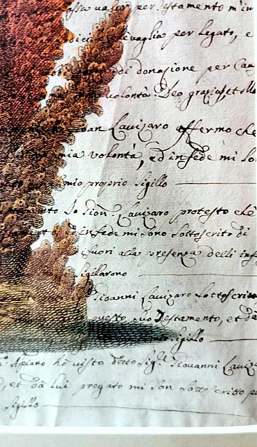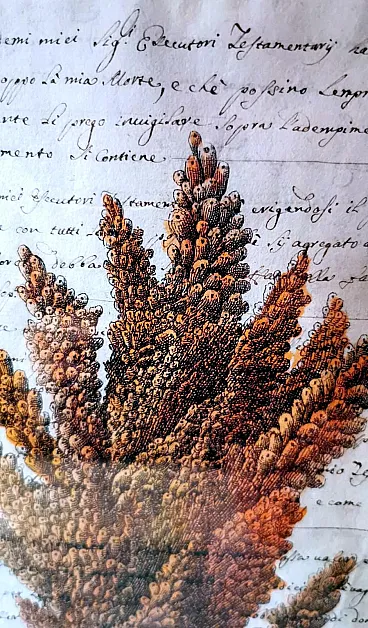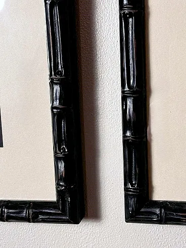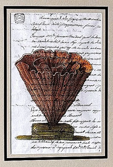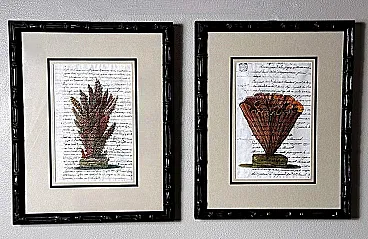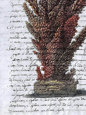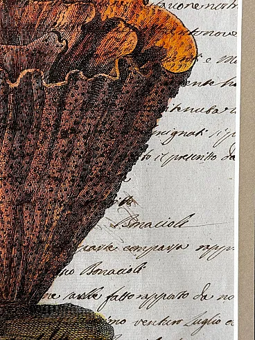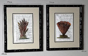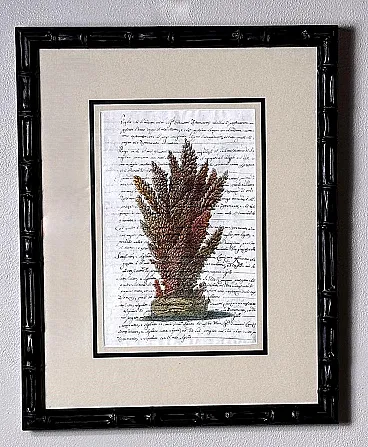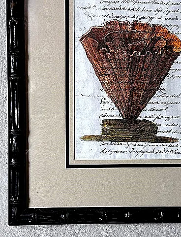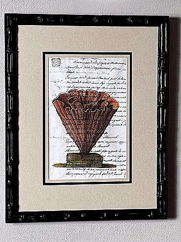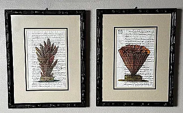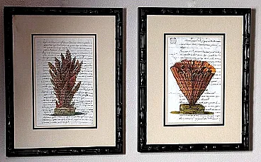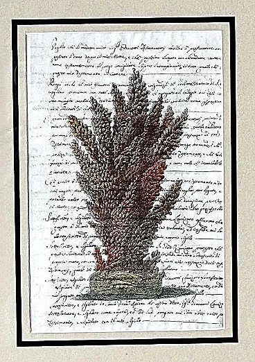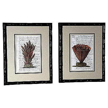 Queste due cornici in "finto bambù" racchiudono stampe a colori su carta, che raffigurano composizioni di coralli marini in forme strane e rare. La stampa a sinistra raffigura un corallo a forma di alga, con dettagli intricati che ricordano alcune specie del genere Acropora; la composizione a destra raffigura un corallo appartenente alla famiglia delle Gorgonie, con la particolarità di essere raffigurato arrotolato su se stesso. Queste stampe colorate, realizzate in Italia, risalgono all'epoca in cui naturalisti e illustratori creavano tavole dettagliate per documentare e studiare la flora e la fauna marina e possono essere datate tra il 1750 e il 1770. La loro unicità sta nel fatto che sono stati utilizzati come supporto per scrivere un testo (una lettera) nello stesso momento o poco dopo. Le stampe antiche a colori con testo scritto a mano sull'intera superficie rappresentano un esempio di una pratica antica chiamata manoscritto su immagine o manoscritto illustrato. Questa tecnica era diffusa in varie epoche e contesti, sia artistici che pratici. Nei manoscritti medievali era comune abbellire i testi con elaborate miniature, illustrazioni e lettere iniziali, spesso a colori. Sebbene non sia del tutto identica, questa pratica riflette l'interesse storico per l'integrazione di testo e immagine. Durante il periodo vittoriano e nei primi anni del 1900, era comune scrivere lettere e messaggi su cartoline illustrate, spesso abbellite con immagini e decorazioni colorate, con scritte che coprivano parte o tutta l'illustrazione. Le stampe giapponesi ukiyo-e spesso combinavano immagini con poesie o descrizioni scritte a mano e questa pratica si diffuse tra il XVII e il XIX secolo. Gli artisti moderni e contemporanei hanno ripreso e reinterpretato questa tradizione: ad esempio, l'artista tedesco Anselm Kiefer ha creato opere che combinano immagini con testi scritti a mano su tutta la superficie. In breve, la scrittura a mano su stampe a colori non era così comune come le semplici illustrazioni, ma ci sono numerosi esempi storici e moderni di come testo e immagine possano essere combinati in modi unici e creativi. Un altro dettaglio degno di nota delle nostre stampe è che quella a destra ha il prezzo "5 soldi" impresso in alto. Il "soldo" è una moneta storica italiana con una lunga e ricca storia. Il soldo ha avuto origine nel Medioevo: la prima emissione documentata risale all'Impero Carolingio, intorno all'800 ADS. Il termine "soldo" deriva dalla parola latina "solidus", che era una moneta d'oro romana introdotta dall'imperatore Costantino nel 309 ADS. Il soldo rimase in corso legale in Italia per diversi secoli. Continuò a essere coniata e utilizzata fino all'unificazione dell'Italia nel 1861, quando fu gradualmente sostituita dalla lira italiana. Le cornici sono particolarmente originali e uniche; sono state realizzate di recente da un maestro ebanista fiorentino, il cui laboratorio si trova nel quartiere più affascinante e vivace di Firenze, San Frediano, famoso per le sue botteghe artigiane dove si producono opere interamente fatte a mano. Il maestro ha utilizzato legno lavorato e intagliato per riprodurre l'aspetto del bambù, una tecnica nota come "faux bamboo". Questo processo utilizza legni duri e resistenti, come l'acero o l'Oak, che vengono intagliati con precisione e poi dipinti per ottenere l'effetto desiderato. La tecnica del "finto bambù" ha origini secolari e ha raggiunto una grande popolarità nel XVIII e XIX secolo in Europa e in America, periodi in cui c'era un fascino per le influenze esotiche e orientali nel design. Questa tecnica era strettamente legata allo stile Chinoiserie, un movimento artistico ispirato all'arte e al design cinese. All'epoca, i mobili e gli oggetti realizzati in vero bambù erano molto ricercati ma difficili da reperire. Per soddisfare la crescente domanda, gli artigiani iniziarono a utilizzare materiali più facilmente reperibili, come il legno e il metallo, per replicare il loro aspetto. Le stampe e le cornici sono in buone condizioni. Dimensioni di una singola cornice: larghezza 39 cm, altezza 49 cm, profondità 3 cm.