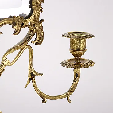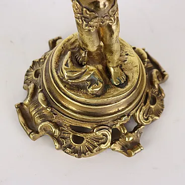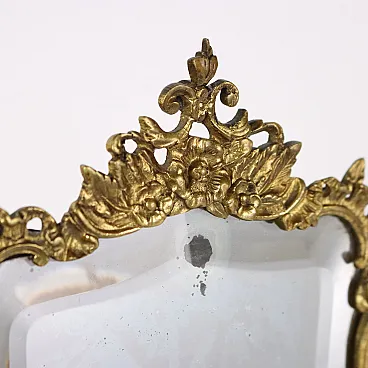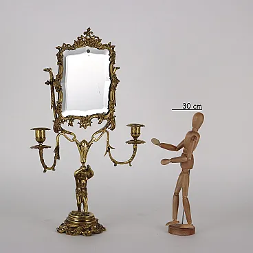 Specchio da toilette in bronzo dorato. Su una base circolare un putto regge una coppia di portacandele che fa da cornice ad uno specchio basculante e bisellato.