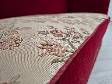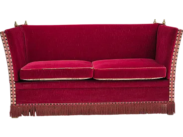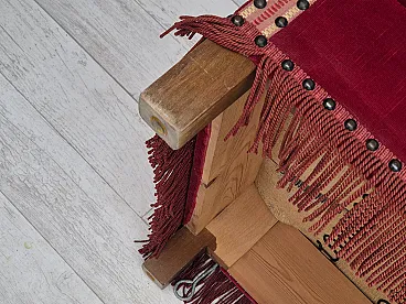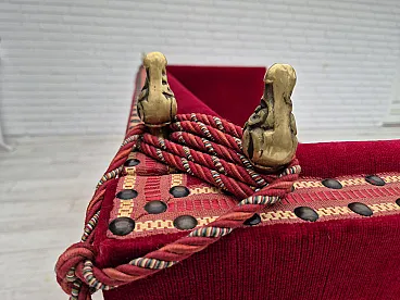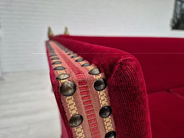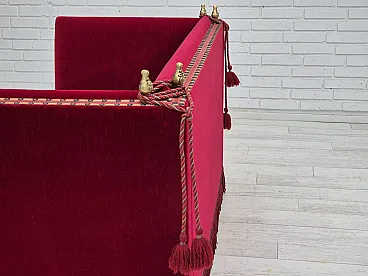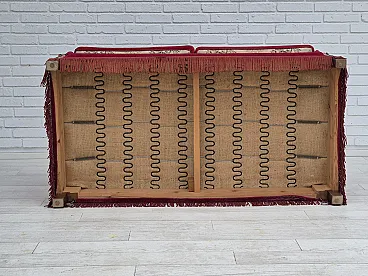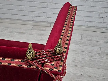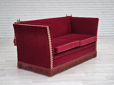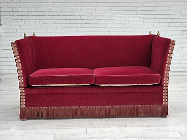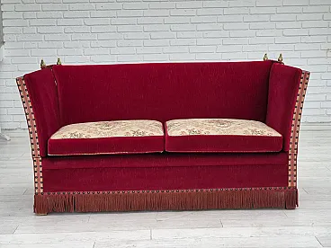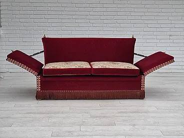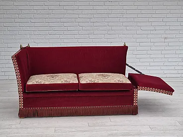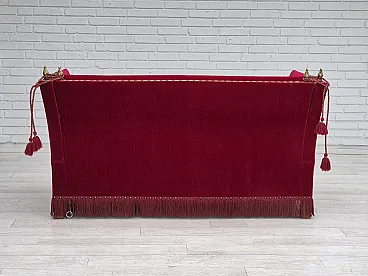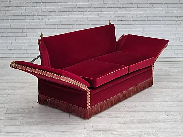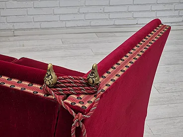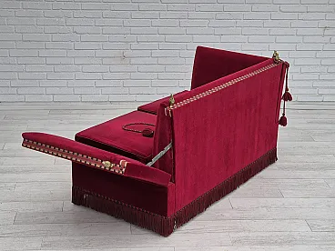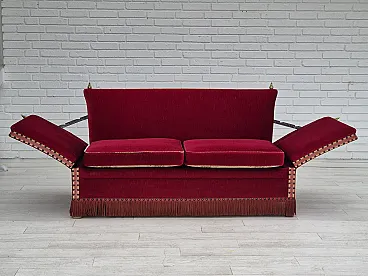 Divano danese a 2 posti "spagnolo" con braccioli ribaltabili degli anni '70. Condizioni originali molto buone: nessun odore, nessuna macchia, costruzione stabile. Velluto per mobili originale rosso ciliegia. Cuscini di seduta double face con molle interne. Bracci abbassabili regolabili, gambe in legno di frassino, portacorde in ottone. Prodotto da un produttore di mobili danese intorno agli anni '70. Il divano "spagnolo" era un design molto popolare in Danimarca negli anni '60 e '70. Il divano è stato controllato da un artigiano. Design scandinavo originale direttamente dalla Danimarca.