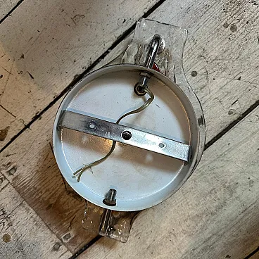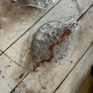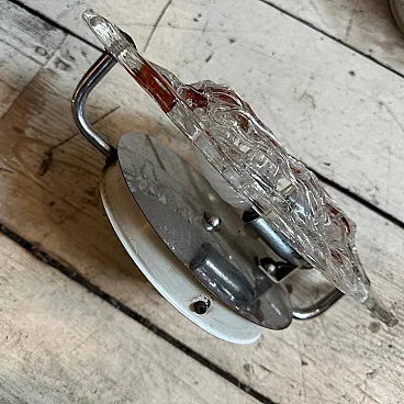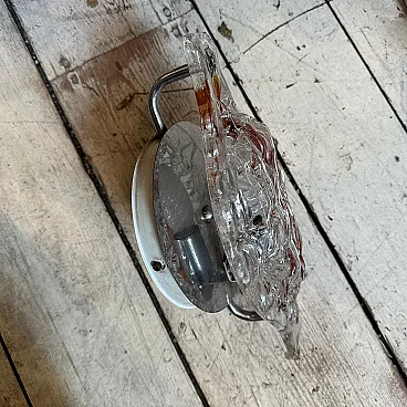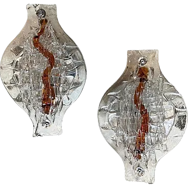 Queste appliques di Mazzega non sono semplici apparecchi di illuminazione, ma pezzi unici che mostrano la fusione di arte e utilità che caratterizza l'artigianato del vetro di Murano. La loro miscela di design audace dell'era spaziale e di elementi in vetro caldi e organici li rende intramontabili e da collezione. Queste applique sono realizzate in vetro di Murano, rinomato per la sua squisita arte e qualità. La combinazione di vetro chiaro e marrone dimostra la tecnica tipica di Mazzega di fondere gli strati di vetro per creare effetti visivi dinamici. Il vetro chiaro è abbinato a ricchi accenti marrone fumé, che si mescolano e sfumano l'uno nell'altro senza soluzione di continuità. Questo effetto sfumato migliora la diffusione della luce e conferisce ai pezzi un bagliore caldo e atmosferico. Queste applique diffondono dolcemente la luce attraverso il vetro, creando intricati motivi sulle superfici circostanti. I toni del marrone aggiungono calore, rendendo l'illuminazione drammatica e accogliente. Queste applique diffondono dolcemente la luce attraverso il vetro, creando motivi intricati sulle superfici circostanti. I toni del marrone aggiungono calore, rendendo l'illuminazione drammatica e accogliente. Ideale per l'illuminazione d'accento in uno spazio di ispirazione retrò o come contrasto unico in un interno moderno e minimalista. Perfetti per i corridoi, i soggiorni o per affiancare un letto o un caminetto, dove possono essere ammirati sia come illuminazione funzionale che come decorazione artistica. Nel complesso sono in ottime condizioni e funzionanti.