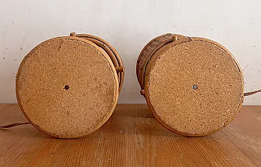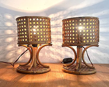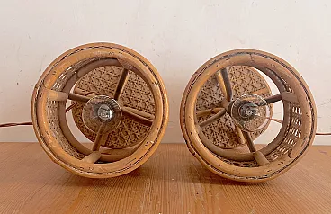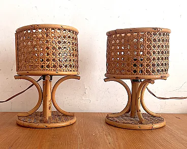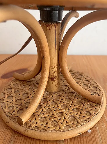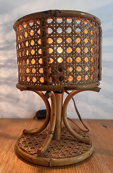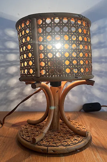 Abat-jour di metà secolo realizzata artigianalmente in Italia tra gli anni '50 e '60. La struttura della lampada, è realizzata con canne di rattan curvate e il paralume in fettuccia di vimini. La canna di rattan per produrre questi articoli veniva intrecciata e piegata a mano dopo averla immersa in vasche per aumentarne la flessibilità. dall'oggetto più grande al più piccolo, necessitava di attenzione, conoscenza e molto tempo per essere realizzata. Questa lampada mostra la patina del tempo e non ha subito restauri. I materiali utilizzati e il design la rendono perfetta per illuminare e decorare un interno in stile Riviera.