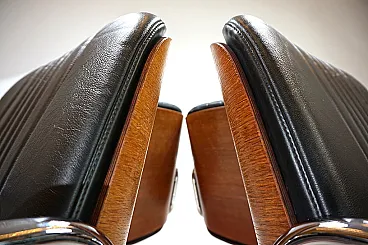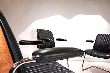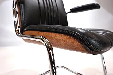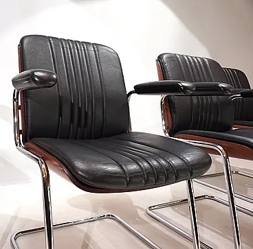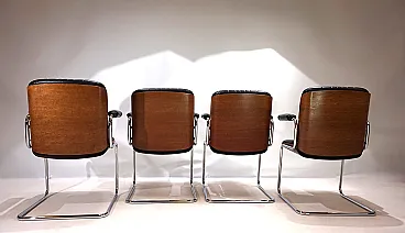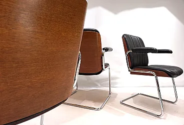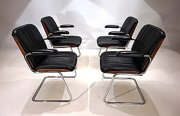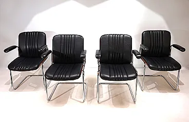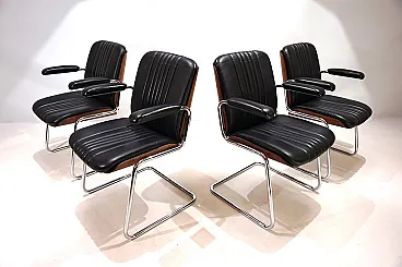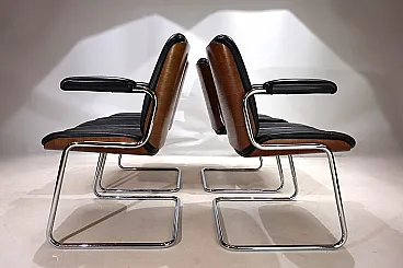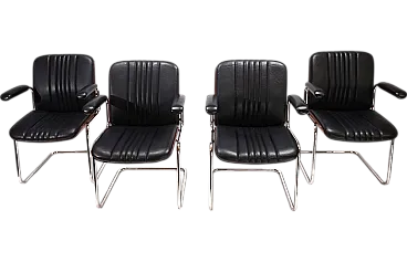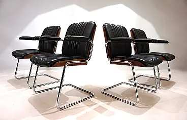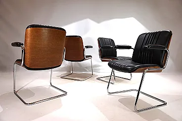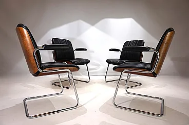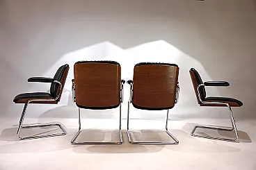 Un set di 4 sedie a sbalzo in pelle con le tipiche scocche in legno Dittert su seduta e schienale. La pelle su tutte le sedie è in condizioni eccellenti, le scocche in legno sugli schienali sono color mogano e in condizioni eccezionalmente buone. La cromatura sulle sedie è impeccabile e splende come il primo giorno. Le sedie hanno braccioli imbottiti. Nel complesso, questo è un set in condizioni eccellenti, cosa che raramente si trova. Questo modello è stato progettato negli anni '60 per Stoll Giroflex e riflette lo spirito dei tempi in modo impressionante.