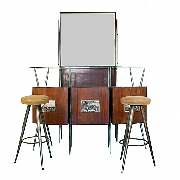 Mobile angolo bar disegnato da Gio Ponti, composto da vetrina con mensole, bancone e due sgabelli, da notare i due cassetti e i ripiani nella parte interna del bancone. Struttura in legno, mensole e piano del bancone in vetro. Design anni '50. Discrete condizioni, presenta segni del tempo. Da segnalare piccoli segni da tarlo come in foto. È stato già effettuato un trattamento anti-tarlo, ma oggetto da restaurare. Misure: larghezza vetrina 93 cm - bancone 165 cm - sgabelli 34 cm profondità vetrina 29 cm - bancone 45 cm altezza vetrina 200 cm - bancone 114 cm - sgabelli 77 cm