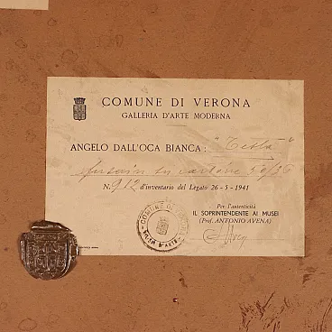 Pastello e biacca su cartone. Al retro è presente cartiglio della Galleria d'Arte Moderna di Verona, che mise in asta benefica numerose opere dell'artista di sua proprietà, e riportante i dati dell'opera. All'opera è allegata anche la fattura di acquisto a tale asta del 1951, con il titolo dell'opera.
