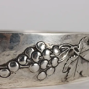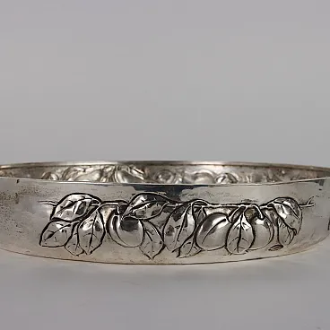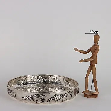 Centrotavola in argento sbalzato con decoro raffigurante tralci di frutta. Marchi dell'argento e dell'argentiere incussi sulla linea del bordo esterno. Grammi 1490.
