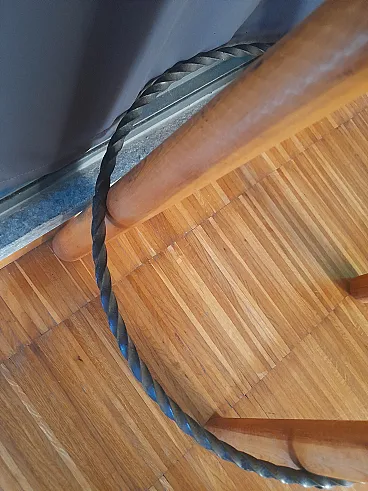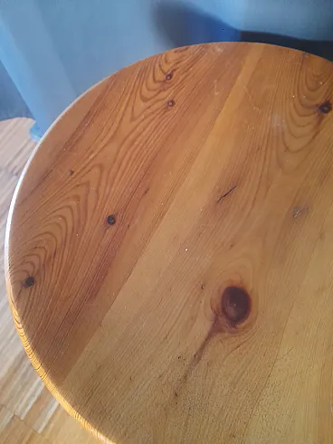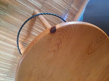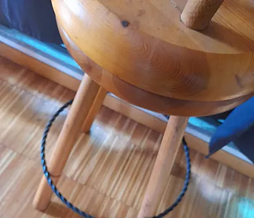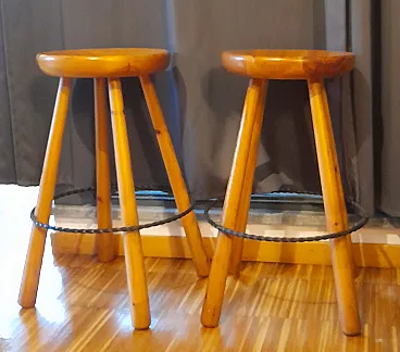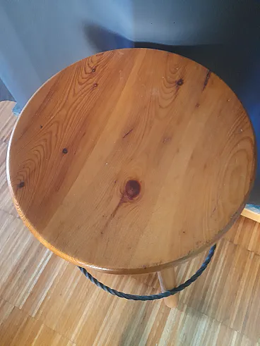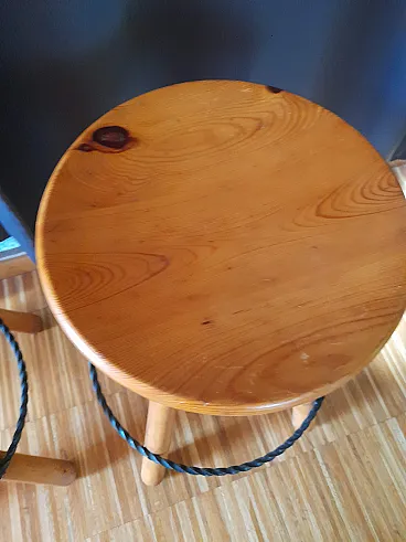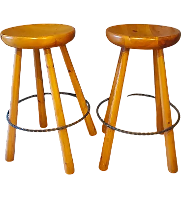 Due Sgabelli in massello di legno di pino nello stile di Charlotte Perriand alto 75 cm, con profilo di ferro attorcigliato per irrigidimento gambi, usati, ma in ottime condizioni, qc segno sulla seduta diametro 37 cm. La larghezza alla base è 45 cm, lo sgabello pesa 7 kg. Ritiro necessario per via del peso e dell’ingombro.