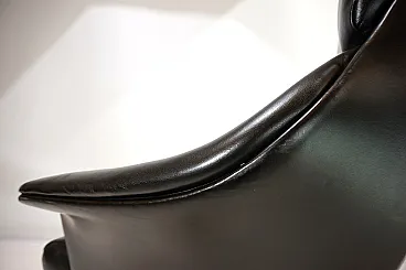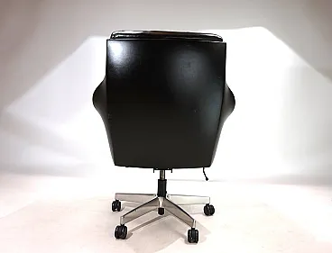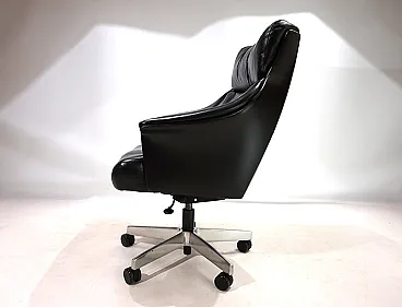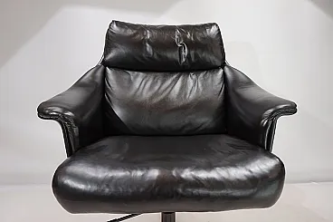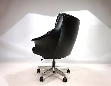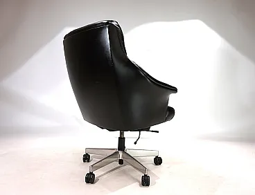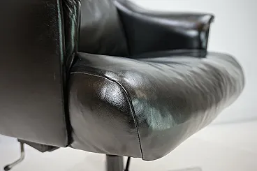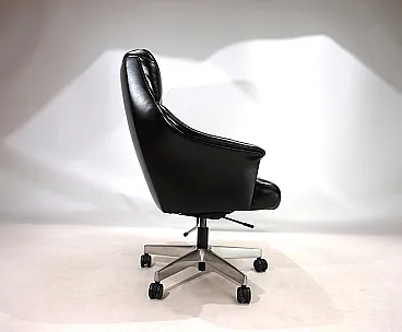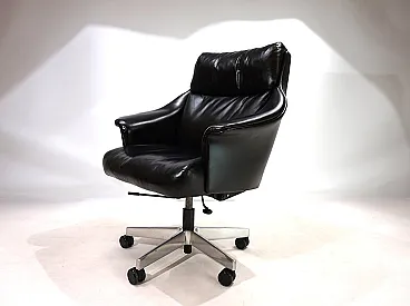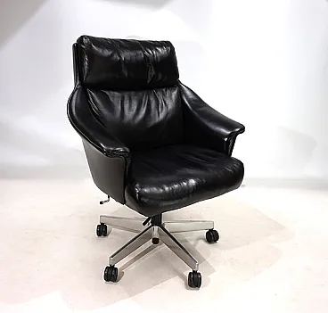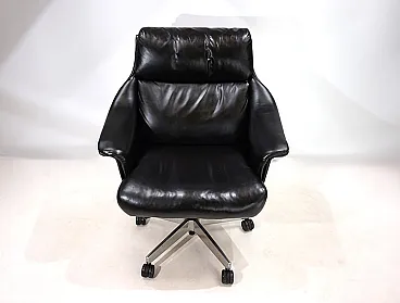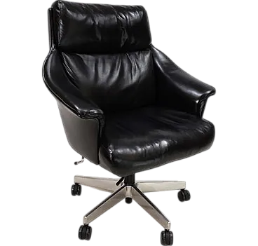 Questa sedia da ufficio realizzata in morbidissima pelle nera è in ottime condizioni. La pelle del sedile e dello schienale, così come i braccioli, non mostra quasi segni di usura. Anche i lati e lo schienale sono rivestiti in pelle e presentano solo 2 piccole abrasioni sugli angoli dello schienale. La sedia poggia su una solida struttura in acciaio inossidabile e rotola senza problemi. La sedia può essere regolata a un'altezza di seduta compresa tra 44 e 57 cm utilizzando l'idraulica dell'altezza. Un meccanismo di inclinazione consente una seduta rilassata. Con questo modello, Stoll Giroflex ha stabilito uno standard per i livelli di qualità possibili per le sedie da ufficio.