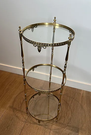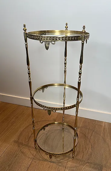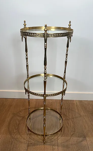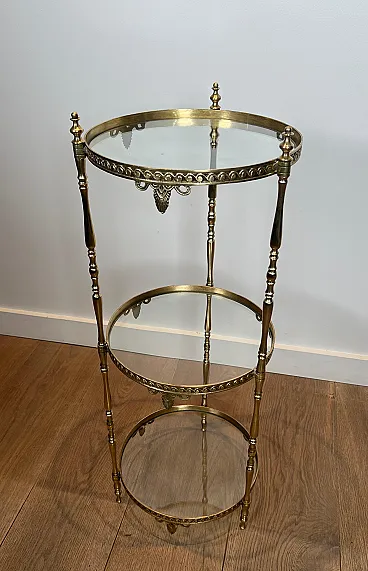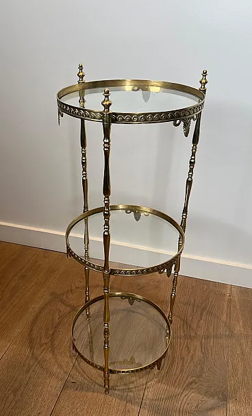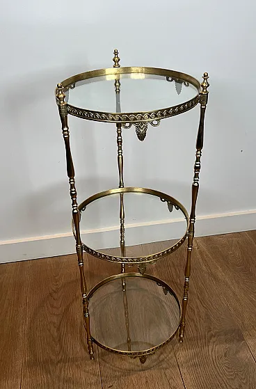 Gueridon rotondo in ottone con tre ripiani in vetro, anni '40