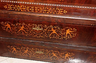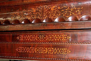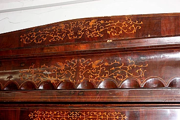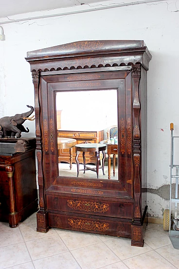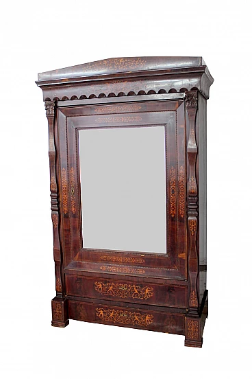 Armadio con un'anta a specchio e due cassetti in legni policromi. La struttura ricorda il frontone di un tempio classico. I motivi decorativi degli intarsi resi in un elegante stile calligrafico rappresentano figure di guerrieri volute vegetali e motivi naturalistici. Gli armadi antichi si differiscono in base al periodo storico di provenienza. Materiale linee forme e decorazioni costituiscono le peculiarità di ogni armadio, dal glamour di quelli Smith alla raffinatezza Imperiale di quelli in stile Luigi XV e XVI. Il nostro si riferisce al periodo storico che va dal 1820 Smith Napoletano. Alcuni studiosi avanzarono l'ipotesi che che i mobili “Smith” Napoletani fossero ispirati ai disegni di George Smith, un ebanista che operò a Londra tra il 1804 e il 1828. Certificato di Autenticità.