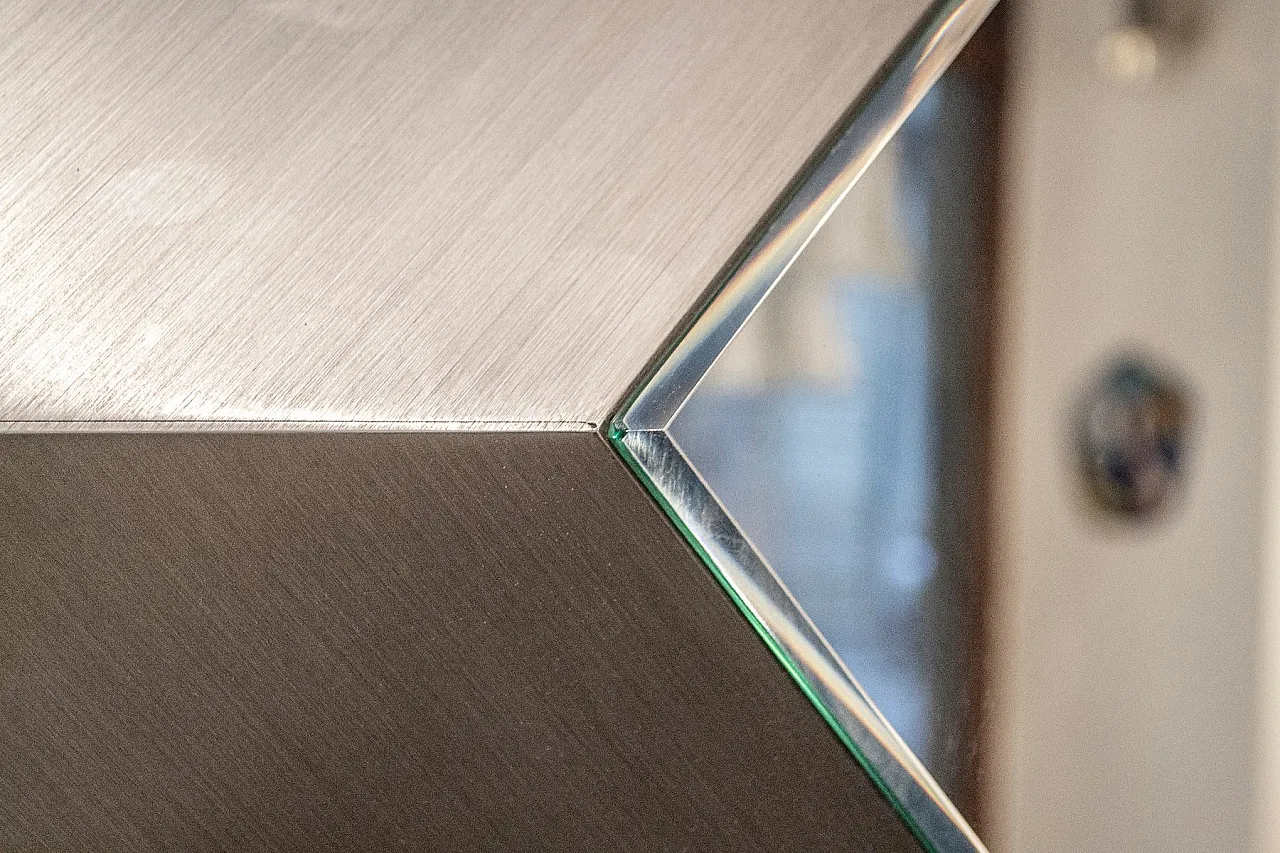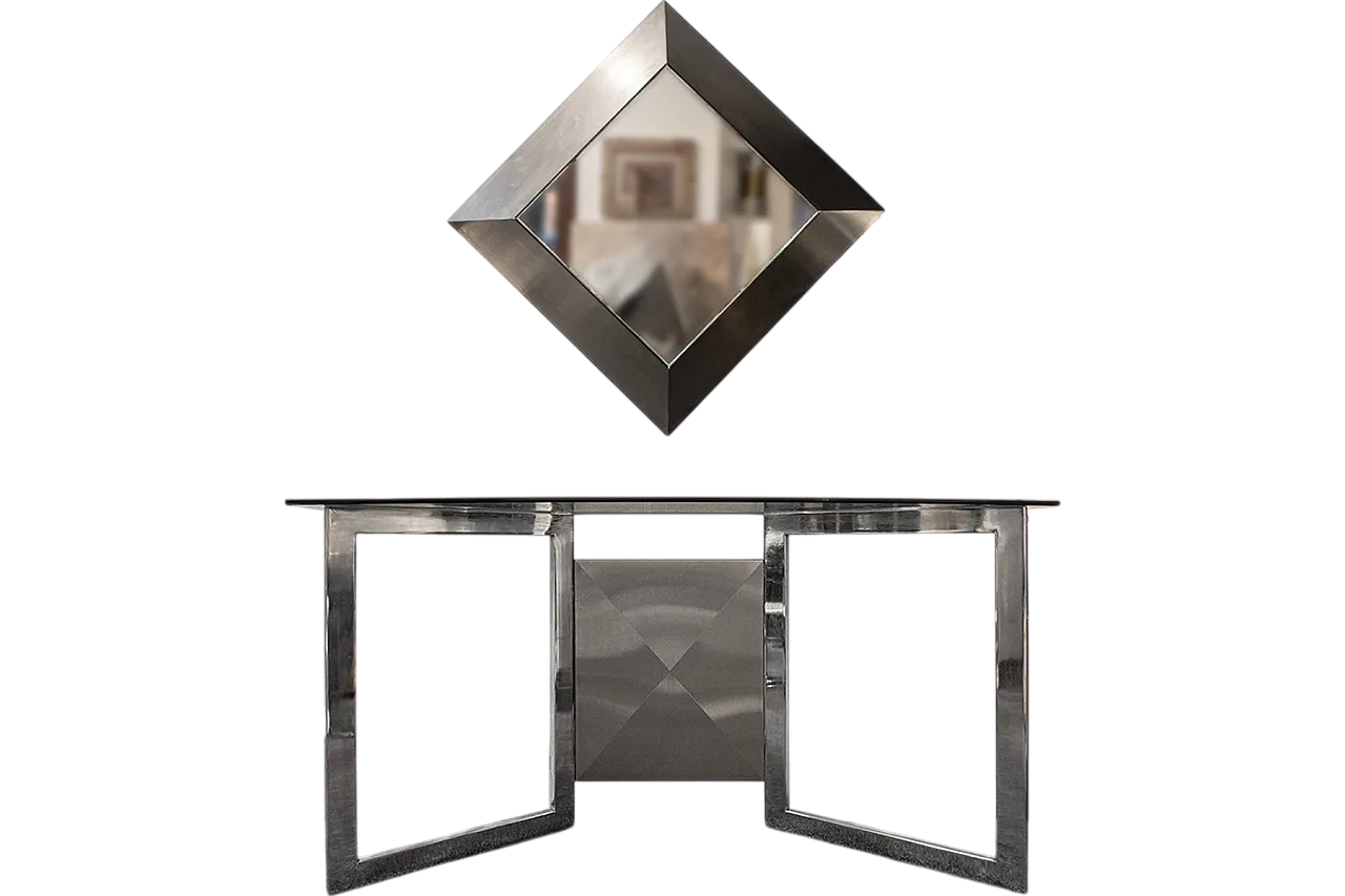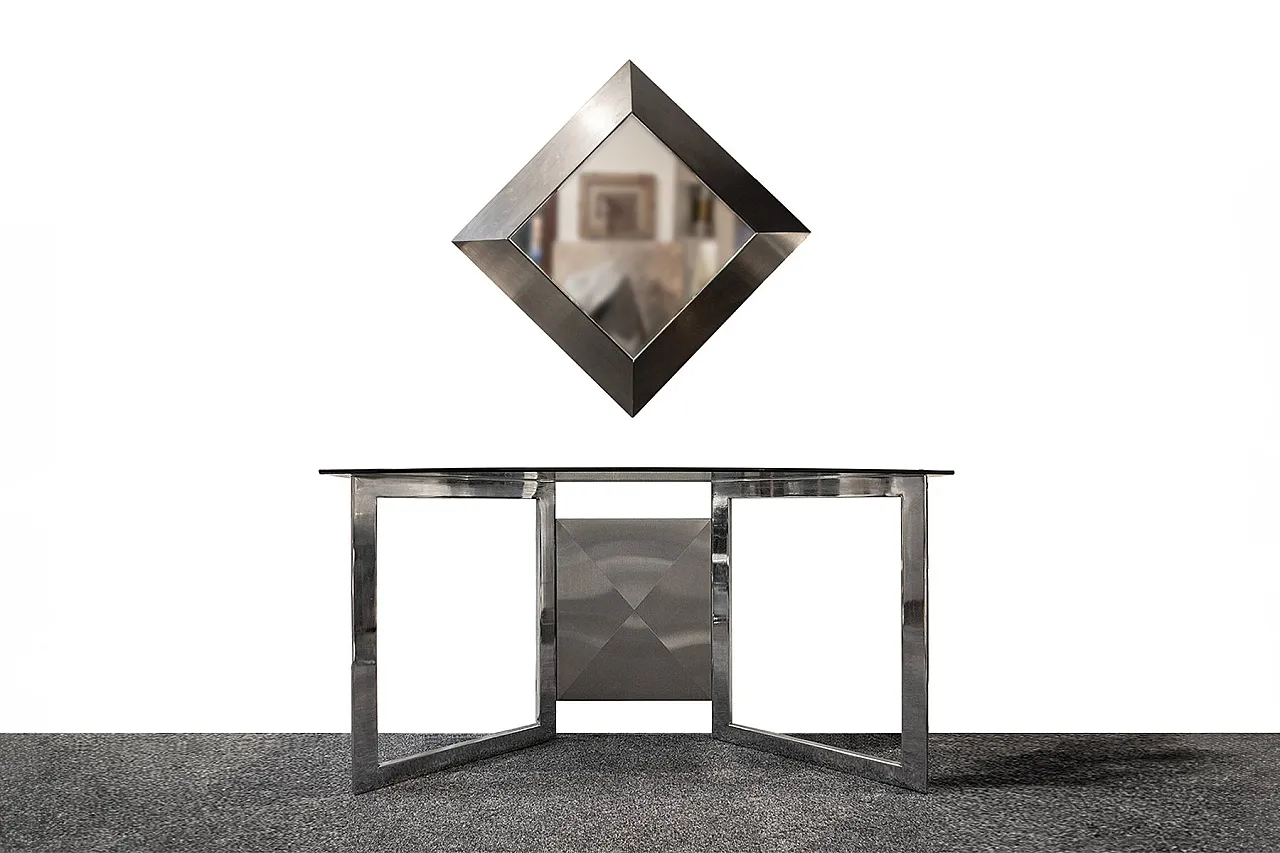 Coppia di consolle con specchio in acciaio e vetro, anni '70