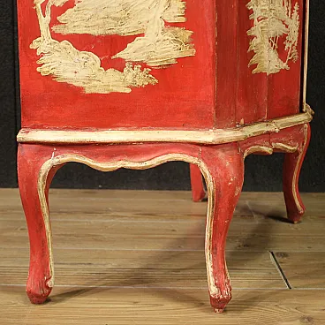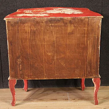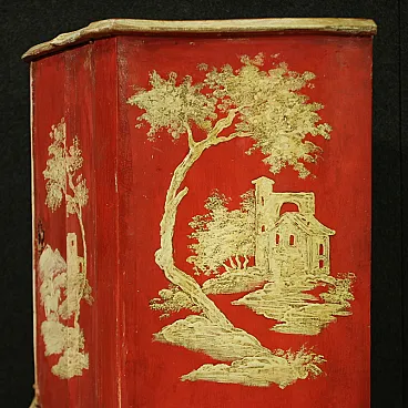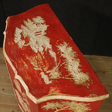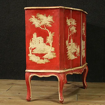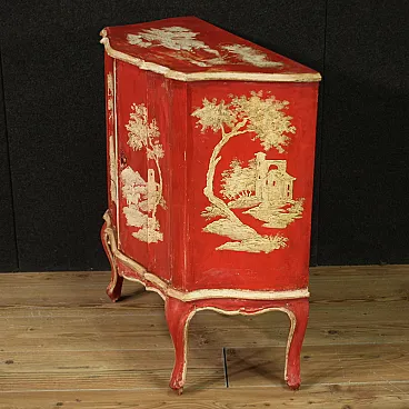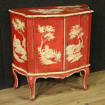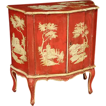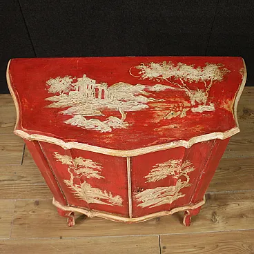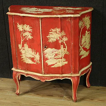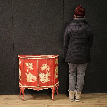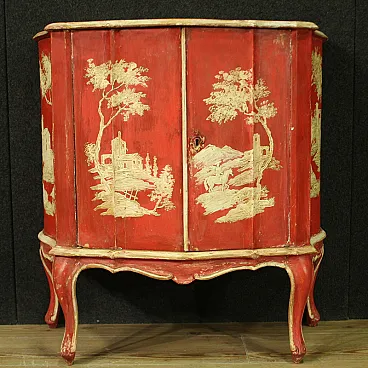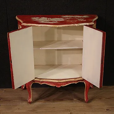 Credenza veneta della metà del XX secolo. Mobile in legno scolpito, dipinto e laccato in arte povera adornato da vedute con architetture. Credenzina a due ante di dimensioni contenute e ottima proporzione. Mobile che offre al suo interno un piano di appoggio più piano a basamento, di buona capacità. Piano superiore ligneo in carattere anch’esso laccato e dipinto (vedi foto). Credenza sostenuta da quattro solide gambe mosse. Mobile facilmente inseribile in diversi punti della casa, per antiquari e arredatori. In bella patina, strutturalmente sano, nel complesso in buono stato conservativo.