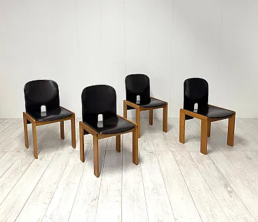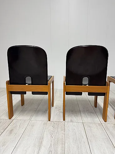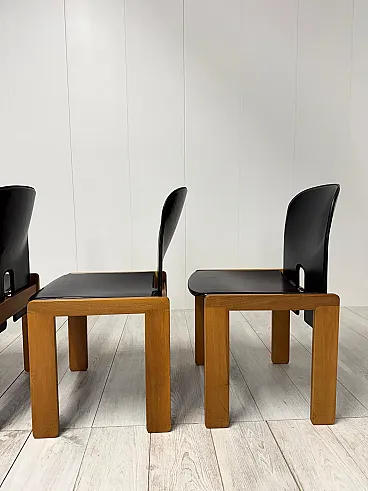 Set di quattro sedie mod. 121, produzione Cassina 1965. Iconico e affascinante, il modello "121" di Afra & Tobia Scarpa mostra ancora una volta la tipica struttura a doppio cavalletto di Scarpa con il caratteristico giunto arrotondato. Il design semplice e minimale ricorda un volume cubico; i supporti, invece, sono superfici sottili e di forma anatomica. La seduta e lo schienale sono sagomati in compensato e fissati con bulloni a traverse lungo il centro che offrono un comfort estremo. Il retro presenta un taglio nella parte inferiore, necessario per la presenza di un rinforzo che reagisce alle sollecitazioni di torsione, più forti in questo punto.