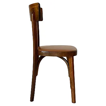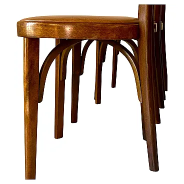 Fabbricate con una solida struttura in legno di faggio, presentano schienali in legno curvato con grazia e una raffinata finitura semi-lucida che ne esalta il fascino sofisticato. I sedili, rivestiti in similpelle marrone intenso, sono in condizioni molto buone, privi di gravi danni o tagli. H seduta: 47 cm
