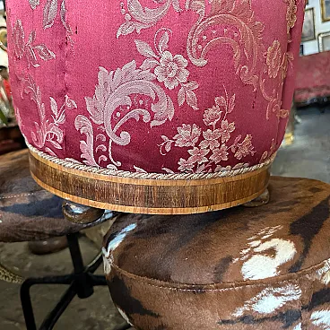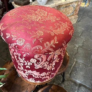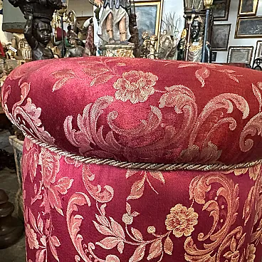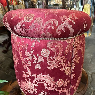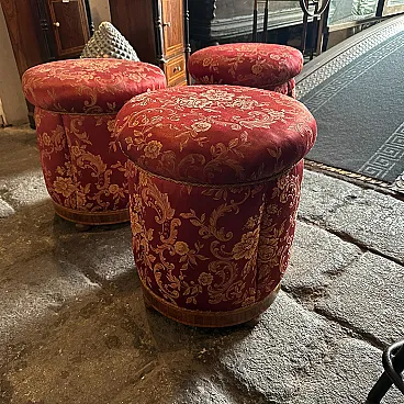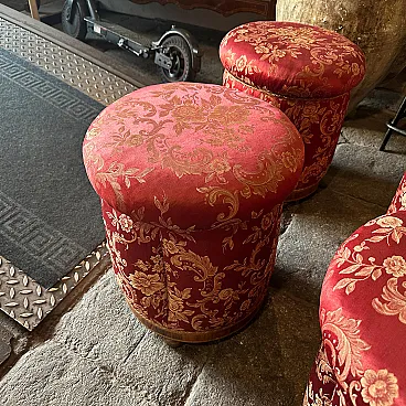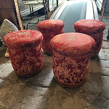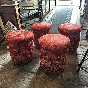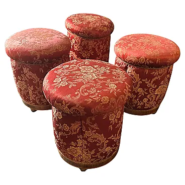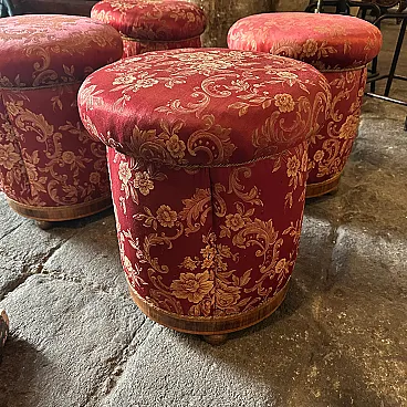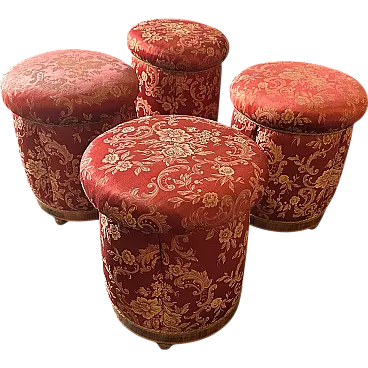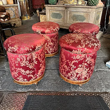 Si tratta di un set di quattro pouf siciliani Louis Philippe, probabilmente del XIX secolo. Ogni pouf è rivestito in un elegante tessuto damascato rosso e oro con intricati motivi floreali e a volute. Il design cilindrico è caratteristico dello stile Louis Philippe, che enfatizza le forme arrotondate e la sobria opulenza. Questi pouf provengono probabilmente da una villa patrizia e riflettono la loro estetica lussuosa e raffinata. Potrebbero essere serviti sia come posti a sedere che come pezzi decorativi, combinando la funzionalità con l'eleganza aristocratica. Sono in condizioni originali con piccoli segni d'uso e d'età visibili nelle foto.