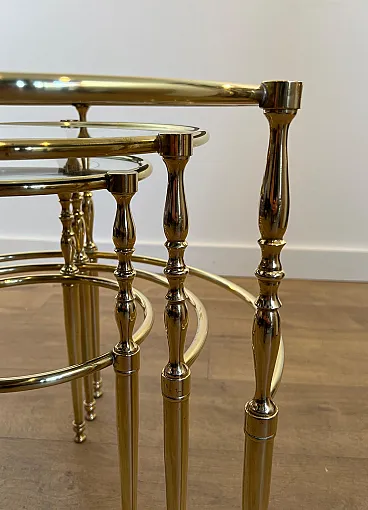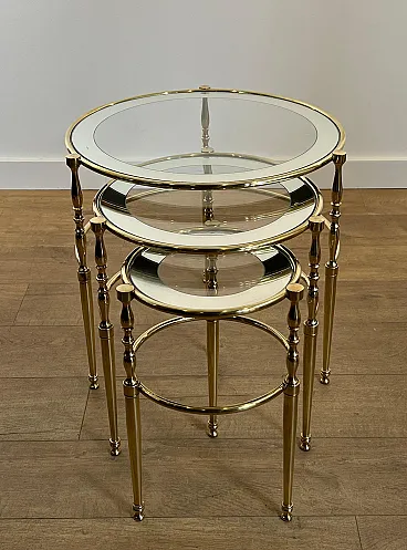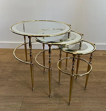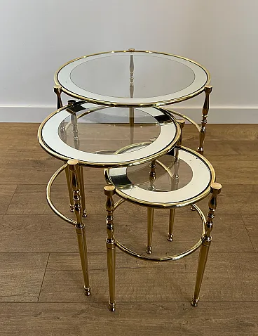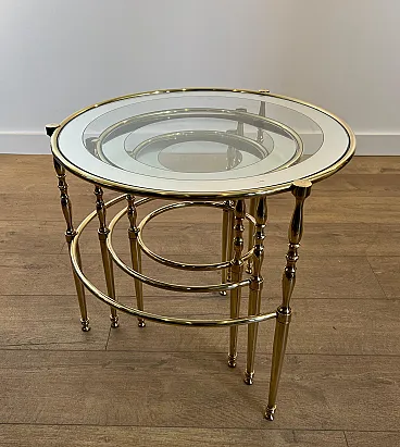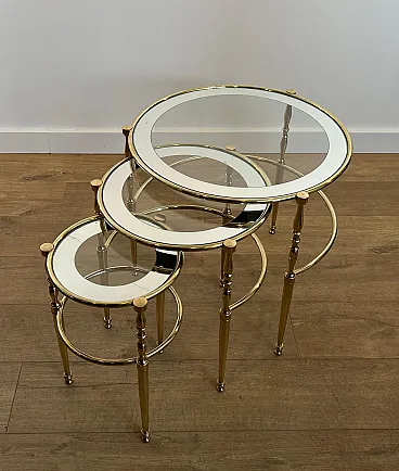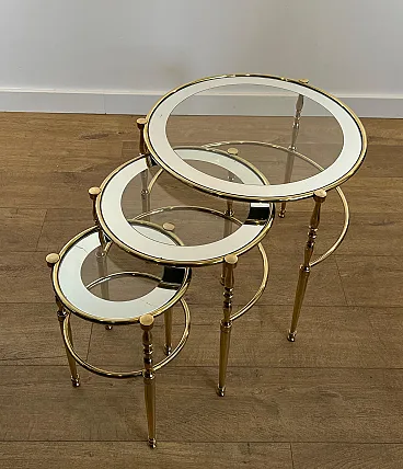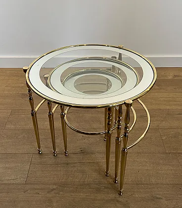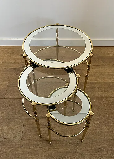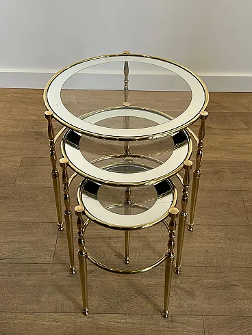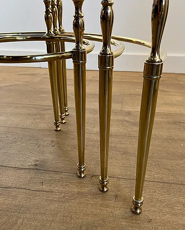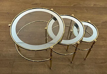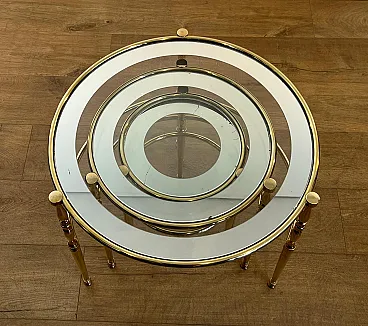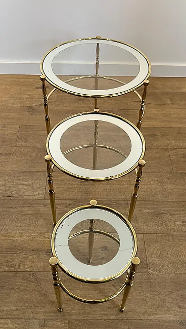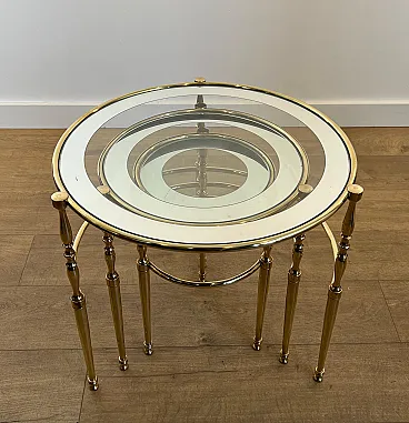 3 Tavolini rotondi in ottone con piani in vetro e argento, anni '40