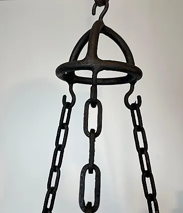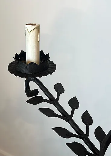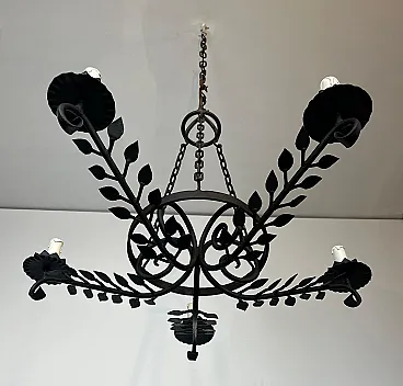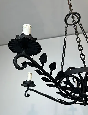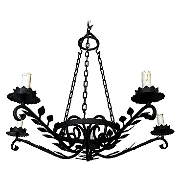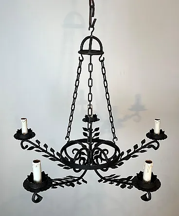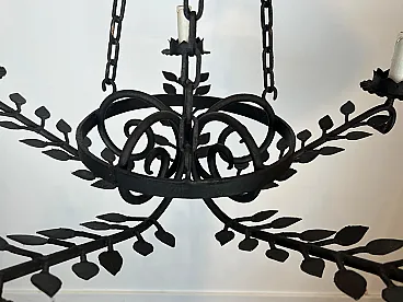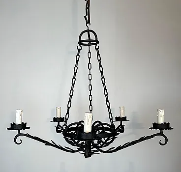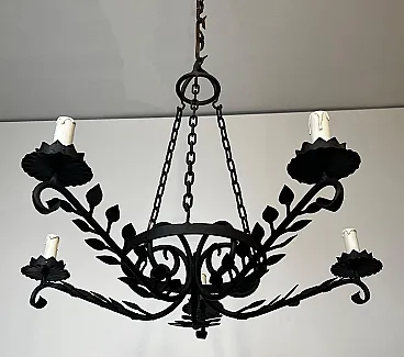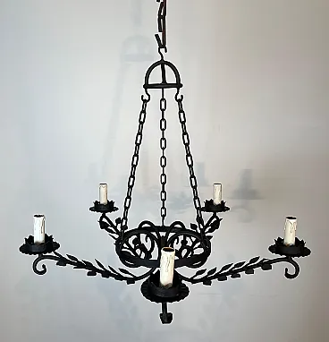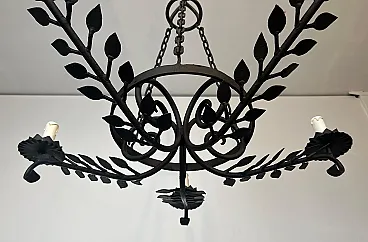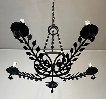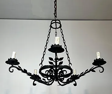 Lampadario in ferro battuto a 5 bracci decorato con foglie, anni '50