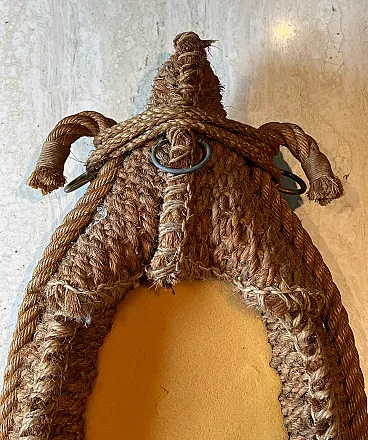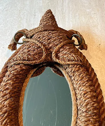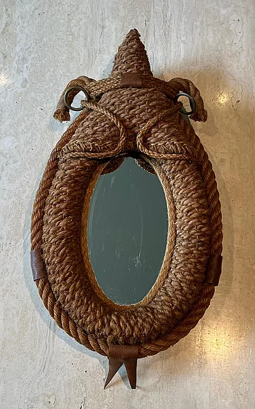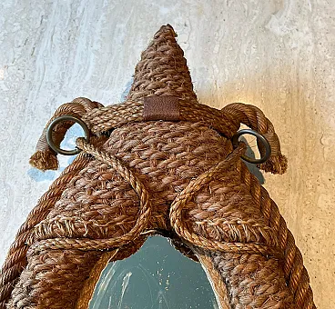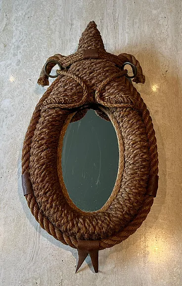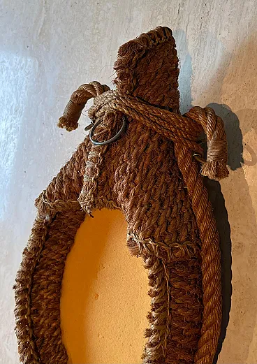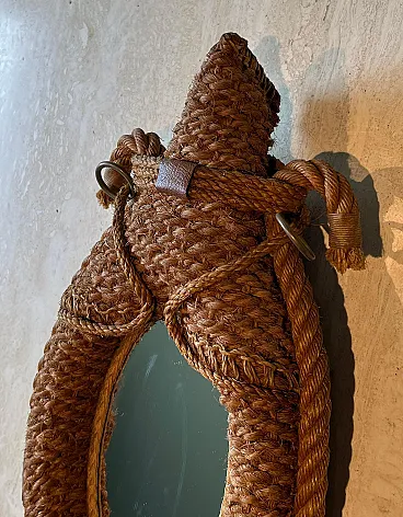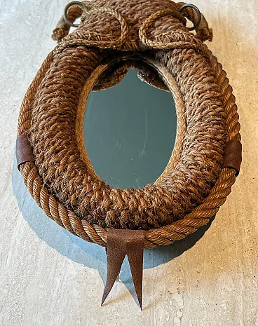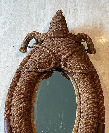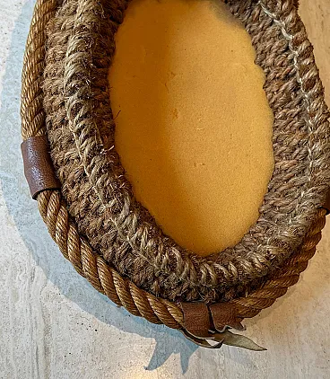 Specchio ovale in corda e pelle di Audoux Minet, anni '70