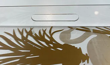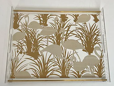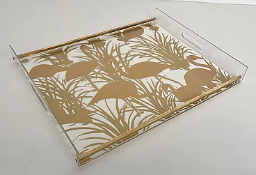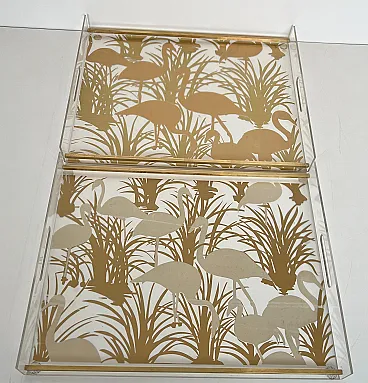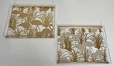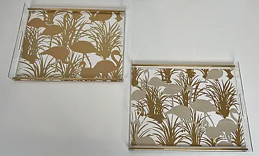 Coppia di vassoi in lucite e ottone con uccelli dorati, anni '70