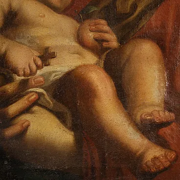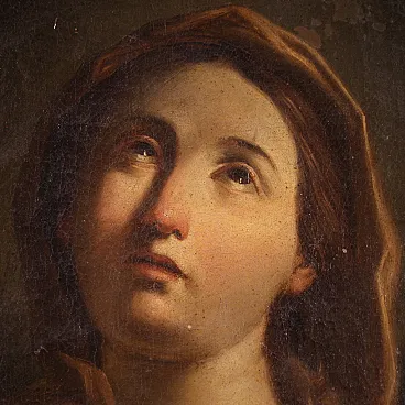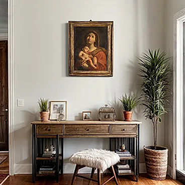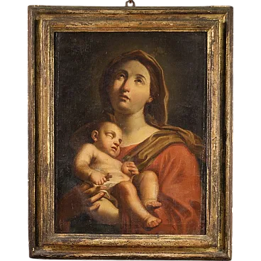 Antica Madonna col bambino della metà del XVII secolo. Dipinto ad olio su tela di notevole qualità pittorica attribuibile al pittore italiano Giovanni Andrea Sirani (1610-1670). Artista bolognese di epoca barocca, fu allievo prediletto di Guido Reni ed è noto soprattutto per essere il padre della grande pittrice Elisabetta Sirani. (L'opera al momento non è accompagnata da expertise ma è possibile richiederla previo pagamento dei relativi costi aggiuntivi). Cornice del XX secolo in legno scolpito e dorato, con alcuni segni del tempo e cadute di doratura (vedi foto). Quadro già restaurato con rintelo, sostituzione del telaio e ripresa del colore in piccoli punti, nel complesso in buono stato conservativo. Luce dipinto H 57 x L 43 cm.