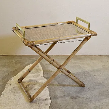 Carrello in canna di bambù, vetro e paglia di Vienna, anni '60