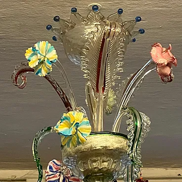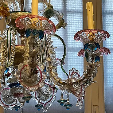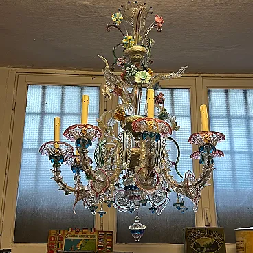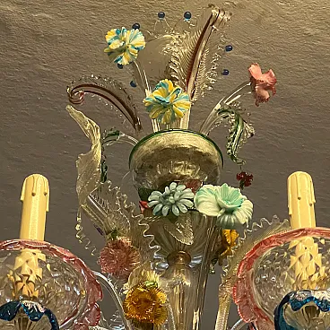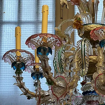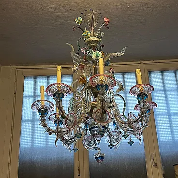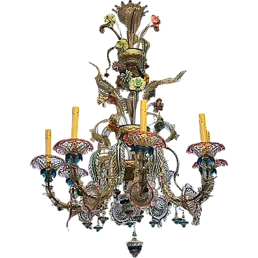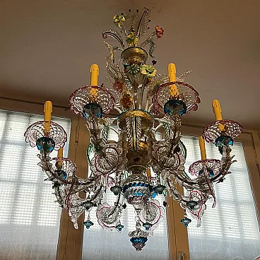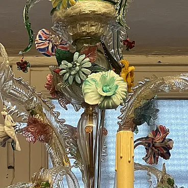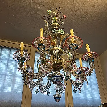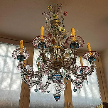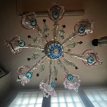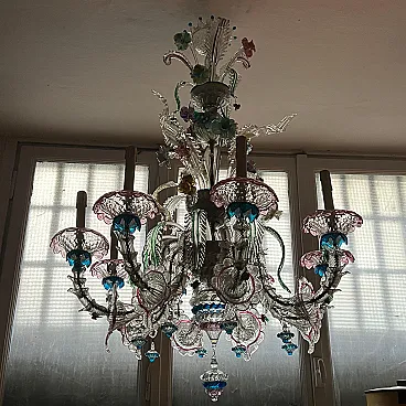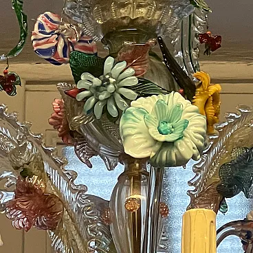 Elegante lampadario in vetro di Murano, realizzato artigianalmente in stile Ca’ Rezzonico e ispirato alla tradizione veneziana. La struttura, composta da un robusto scheletro interno in ferro, garantisce solidità e durata, mentre il vetro trasparente, impreziosito da dettagli colorati in pasta vitrea, dona luminosità e leggerezza all’insieme. Il design classico è reinterpretato con tonalità vivaci, come il blu e il rosa nei bobeches, e un’esplosione di fiori e foglie multicolori, che ne esaltano l’estetica raffinata e sofisticata. Questo modello, che fonde il fascino storico con un tocco di vivacità contemporanea, è perfetto per valorizzare ambienti minimali o progetti d’arredo dal respiro internazionale. Composto da numerosi elementi in vetro sapientemente assemblati, è semplice da smontare e rimontare. Inoltre, l’intero impianto elettrico è nuovo e perfettamente funzionante, garantendo non solo sicurezza ma anche bellezza, e praticità. Prodotto a Murano, nei pressi di Venezia, questo capolavoro artigianale rappresenta l’eccellenza dell’illuminazione decorativa. Il lampadario presenta minimi difetti, come minuscole sbeccature sui petali dei fiori, a riprova della sua età.