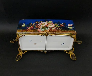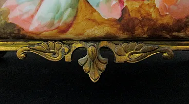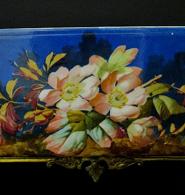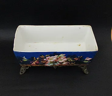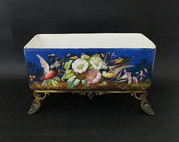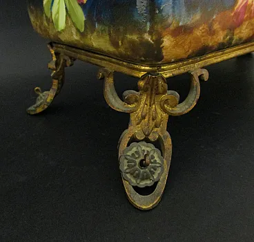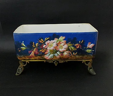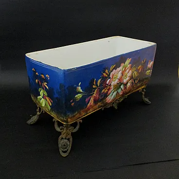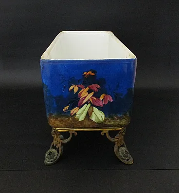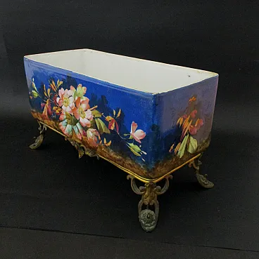 Splendido antico Vaso Liberty francese Parigino epoca 1930 realizzato in porcellana con base in bronzo lavorato , impreziosito da meravigliosi decori floreali , sul fondo è firmato " F. B. Paris " , molto bello e di notevole impatto scenografico grazie anche ai dettagli realizzati con accuratezza e raffinatezza , ideale come oggetto d'arredo , eventuali zone più chiare sono dovute al riflesso della luce artificiale , condizioni ottime come da foto. Dimensioni: altezza cm. 20 - larghezza cm. 17 - lunghezza cm. 36