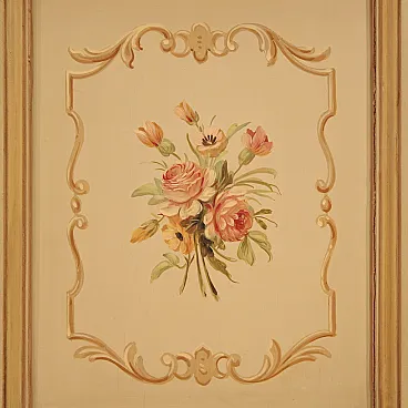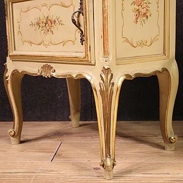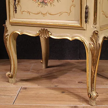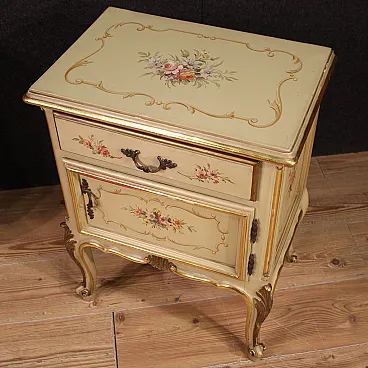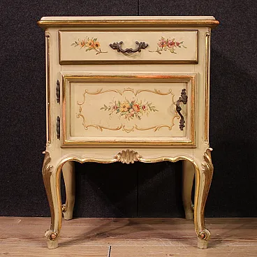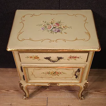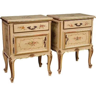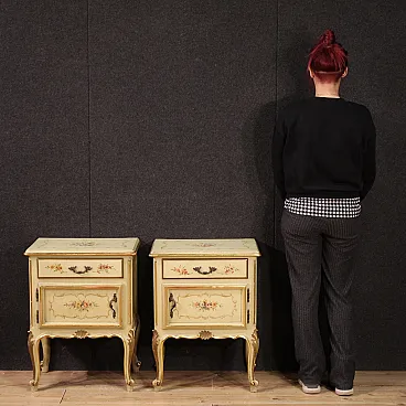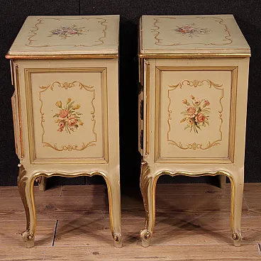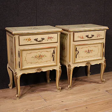 Coppia di comodini veneziani della metà del XX secolo. Mobili in legno finemente laccato, dorato e dipinto a mano con decori floreali di grande piacevolezza. Comodini muniti di un’anta e un cassetto, di buona capacità. Piano superiore ligneo in carattere anch’esso laccato e dipinto di buona misura e servizio. Comodini da camera o salotto sostenuti da gambe mosse con piedini a ricciolo (vedi foto), di buona solidità e stabilità. Mobili di bella linea e piacevole arredamento, in buono stato conservativo.