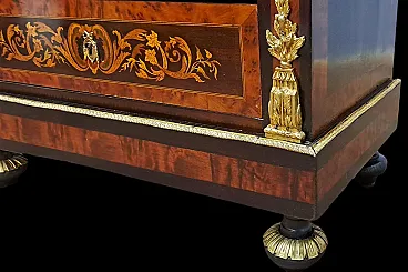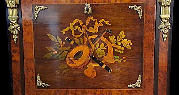 L' intera superficie è finemente intarsiata con motivi di ispirazione vegetale e florale in legni vari di frutto.