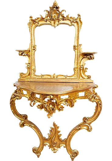Descrizione: Consolle antica con specchio Luigi Filippo Napoletana in legno dorato e intagliato appartenente alla seconda metà del XIX secolo.