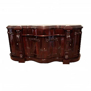 Servante a serpentina Inglese in piuma di mogano quattro porte. Particolarmente adatta a soddisfare sia problemi di spazio che estetici. Esso è un elemento indispensabile per chi vuole avere un arredo di gran gusto, ma sopratutto di gran classe. Restaurata dai nostri maestri artigiani a regola d'arte con metodo tradizionale gommalacca e alcool. Dotata di certificato di Autenticità.
