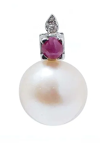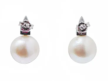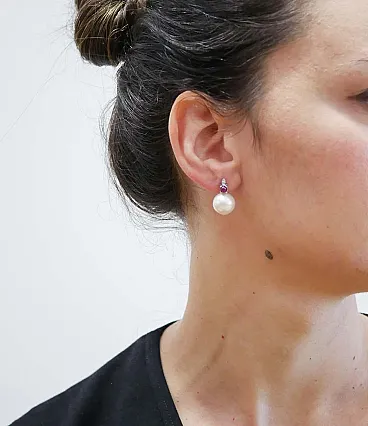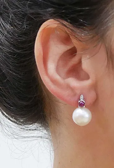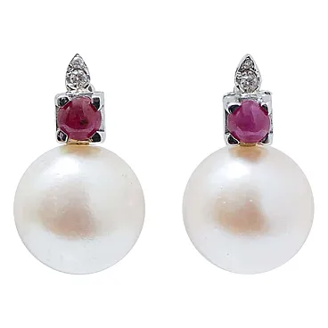 Orecchini con perle bianche, rubini, diamanti, oro bianco, anni 2000