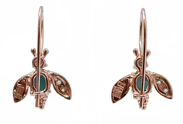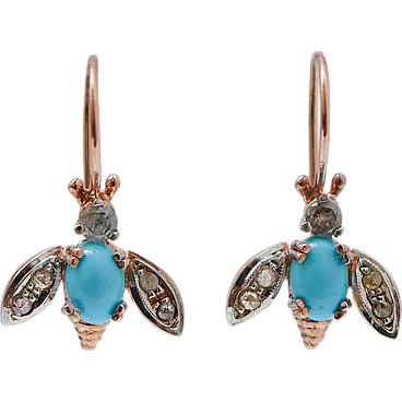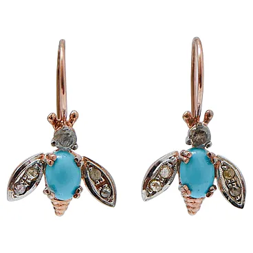 Orecchini a mosca in turchese, diamanti, oro rosa e argento, anni '70