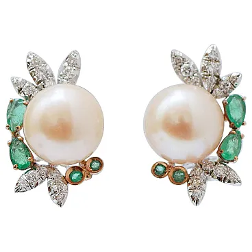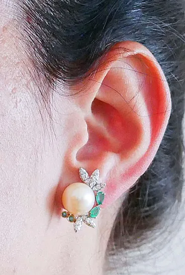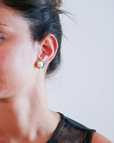 Orecchini in oro bianco con perle, smeraldi, diamanti, anni '70