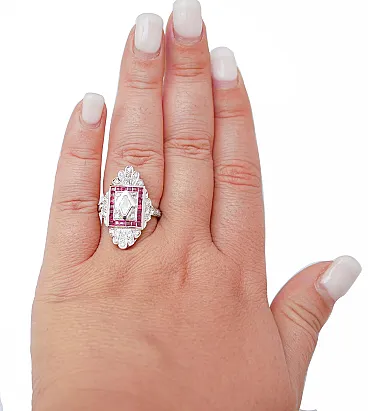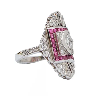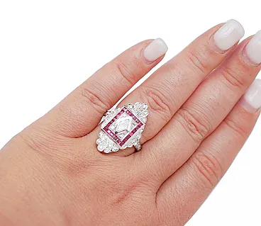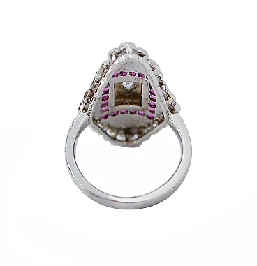Anello in platino con diamante centrale, rubini, diamanti, anni '70