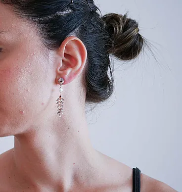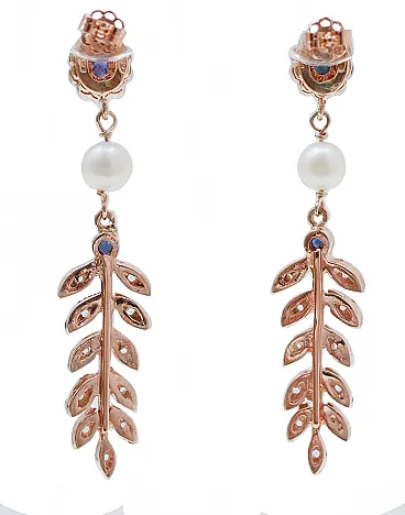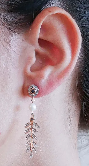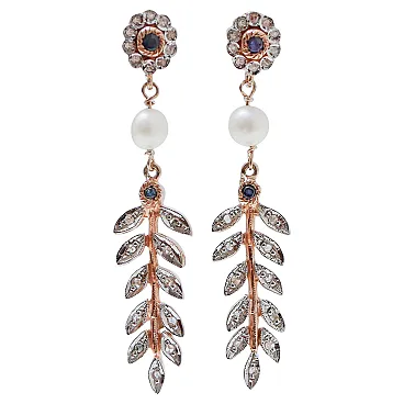 Orecchini in oro rosa e argento con zaffiri, diamanti, perle, anni '60