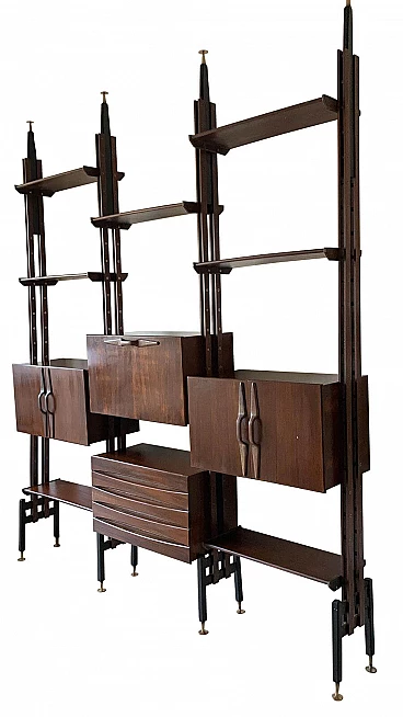 Libreria modulare in palissandro anni 50/60 attribuita a Franco Albini La libreria è composta da 7 mensole , 2 armadietti ad ante , 1 cassettiera ed 1 armadietto bar. I piedini di fissaggio a pavimento ed a soffitto sono in ottone . La libreria è in buonissime condizioni , presenta chiaramente piccoli segni di usura in linea con l'eta.