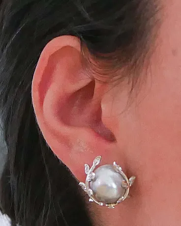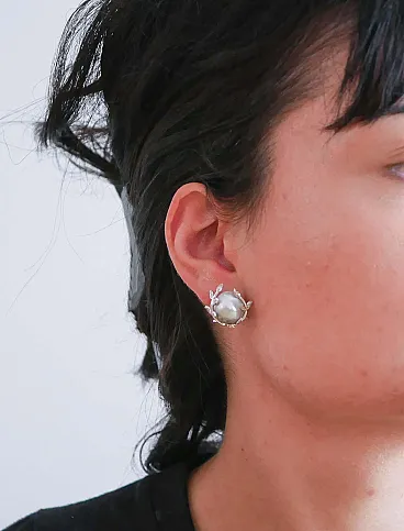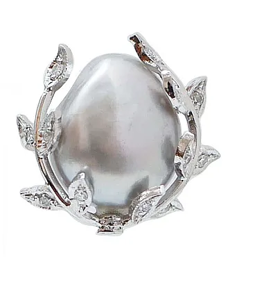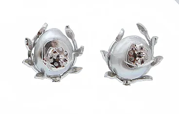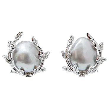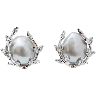 Orecchini retrò in platino con perle grigie, diamanti, anni '70