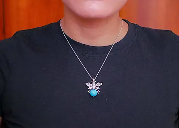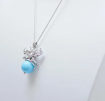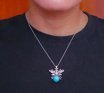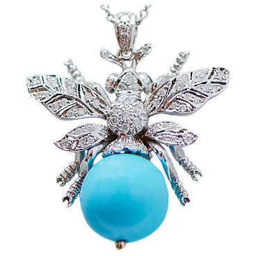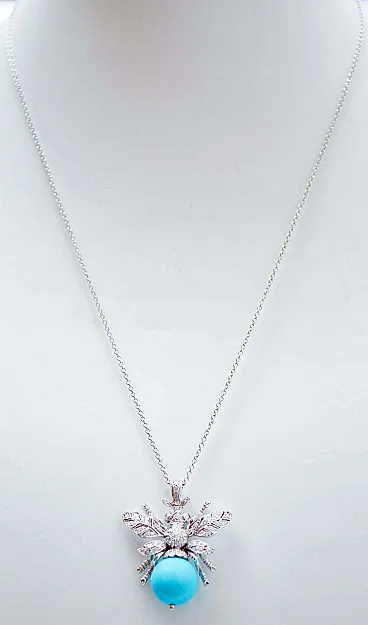 Magnesite, diamanti, zaffiri, ciondolo Fly in oro bianco, anni '70