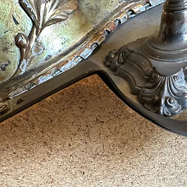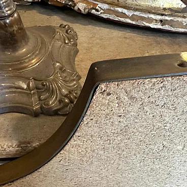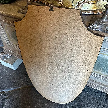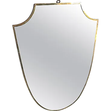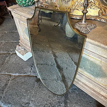 Uno specchio da parete in ottone massiccio progettato e realizzato in Italia alla maniera di Gio Ponti, che utilizzava questo tipo di specchio nelle più belle case milanesi degli anni '50. L'ottone vanta una bella patina originale, mentre il vetro rimane originale. La forma a scudo era un segno distintivo degli specchi disegnati da Gio Ponti. Lo specchio da parete è uno splendido pezzo di design vintage che incarna l'essenza dell'estetica della metà del secolo scorso, mostrando la sua caratteristica miscela di funzionalità, eleganza e influenze moderniste. Con la sua presenza audace e accattivante, diventa un punto focale in qualsiasi stanza. La forma dello scudo ricorda gli scudi delle antiche armature, aggiungendo un tocco di riferimento storico al design. La cornice dello specchio è realizzata in ottone massiccio, un materiale molto diffuso nella metà del secolo scorso. La calda tonalità dorata dell'ottone completa la superficie riflettente dello specchio, creando un effetto visivo armonioso. La struttura in ottone è elegante e minimalista, con linee pulite e una finitura liscia che mette in mostra la semplicità e la raffinatezza del design moderno di metà secolo. Lo specchio stesso è di grandi dimensioni e consente di riflettersi e di fungere da elemento funzionale e decorativo nella stanza. La sua superficie riflettente, chiara e priva di fronzoli, enfatizza lo scopo dello specchio e migliora l'illusione di spazio e luce nell'area circostante. Questo specchio da parete racchiude lo spirito del design degli anni '50, combinando forme organiche e geometriche con materiali di alta qualità per esemplificare l'impegno dell'epoca sia per la forma che per la funzione. Si tratta di un pezzo di design senza tempo che continua a ispirare e affascinare gli appassionati dell'estetica moderna di metà secolo.