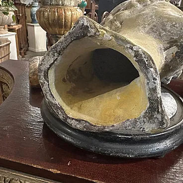 Questo Busto di Apollo in terracotta siciliana degli anni '30 del Novecento è un pezzo accattivante che racchiude abilità artistica, significato culturale e fascino storico. La sua presenza a grandezza naturale, il soggetto classico e l'origine siciliana ne fanno un'opera d'arte unica e avvincente. Il busto raffigura Apollo, il dio greco della musica, della poesia, della luce e della guarigione. An He è spesso raffigurato come una figura giovanile e idealizzata, che irradia bellezza e intelligenza, in stile neoclassico. Questo movimento, nato a metà del XVIII secolo, traeva ispirazione dall'arte e dall'architettura dell'antica Grecia e di Roma. Enfatizzava l'equilibrio, l'armonia e le forme idealizzate. La terracotta ha un tono naturale e terroso, con variazioni di colore dovute al processo di cottura e all'età. La testa di terracotta è in buone condizioni generali.