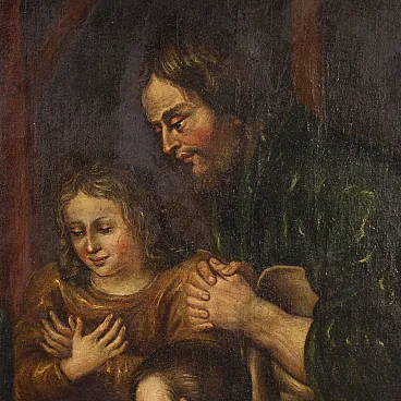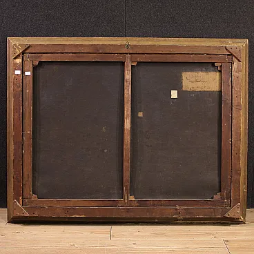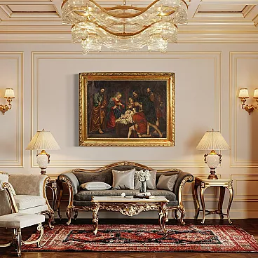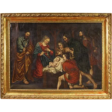 Antico dipinto francese della fine del XVII secolo. Opera olio su tela, in prima tela, raffigurante soggetto di arte sacra, Adorazione dei pastori, di buona mano pittorica. Quadro di grande misura e impatto adornato da cornice non coeva in legno e gesso, del XIX secolo, scolpita e dorata. Dipinto che si sviluppa in orizzontale, di piacevole proporzione, caratterizzato da colori vivaci. Opera che ha subito qualche piccolo intervento di restauro conservativo nel corso del tempo con l’applicazione di tre toppe visibili sul retro della tela. Quadro nel complesso in buono stato conservativo e in bella patina. Luce dipinto H 95,5 x L 132 cm.