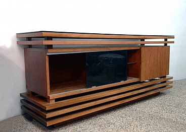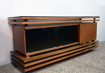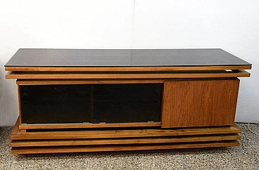 Credenza in noce con piano in vetro nero, anni '70
