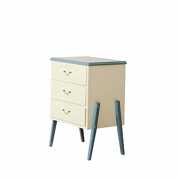 Modello originale Ikea anni ’60, di colore blu e bianco. Simpatico mobiletto in legno di abete con tre cassetti. Perfetto come comodino per una camera da ragazzi o come mobile da ingresso. Sono presenti dei segni del tempo come alcuni aloni più chiari. Presta attenzione alle fotografie.