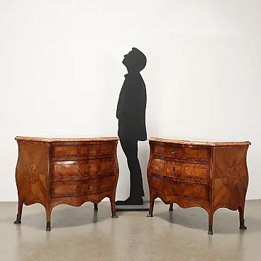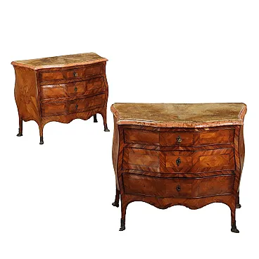 Coppia di comò napoletani d'epoca rococò. Completamente bombati nelle forme, ovvero realizzati con mossa verticale e orizzontale, sono realizzati con lo scafo interno in pioppo e poi lastronati in Bois de violette quadripartito arricchito con bordure in vena contrapposta, riserve sui cassetti e rosone polilobato sui fianchi. Il tutto è giocato contrapponendo la marcata venatura dello stesso legno, anche gli spigoli pronunciati dei montanti e il ciglio dei cassetti sono realizzati in bois de violette lavorato di testa. Il piano presenta sul fondo un alzatina di inserimento ad una boiserie parietale a cui si appoggiano i piani, realizzati in marmo lastronato in un raro alabastro fiorito con bordure in marmo rosso Verona. Secondo i canoni costruttivi della più alta ebanisteria napoletana, i cassetti e il piano, sono separati da un diaframma in pioppo per limitare l'accesso alla polvere. I piedi sono rivestiti da scarpette in bronzo che hanno perso la doratura. Queste applicazioni, come la forma bombata dei mobili sono molto simili alla coppia di comò pubblicata da Alvar Gonzalez-Palacios , unica differenza (oltre alla decorazione ad intarsio) il grembiale del fronte che si abbassa con una doppia mossa sul fronte e con un movimento asimmetrico nei fianchi. Sul retro etichetta di trasporto mentre sotto uno dei piani c'è un etichetta in carta con cera lacca con segnato "C Napoli - 47 - Pignatelli".