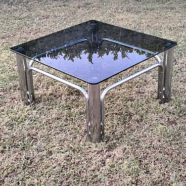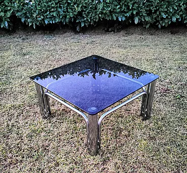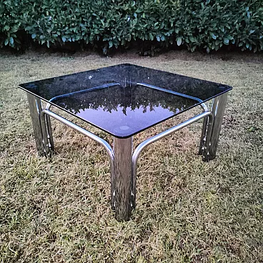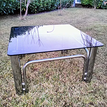 TAVOLINO DA SALOTTO ANNI 70 STRUTTURA ACCIAIO CROMATO PIANO IN VETRO FUMÉ .