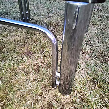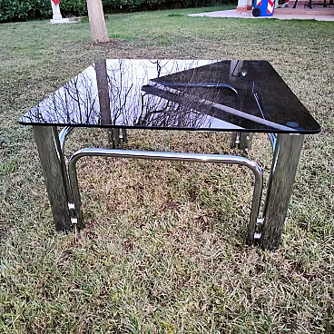 Piano in vetro temperato fumè che dona leggerezza visiva e un elegante contrasto con le gambe in acciaIo cromato lucido, disposte in una combinazione dinamica e minimalista, tipica dello stile futuristico dell'epoca. CONDIZIONI OTTIME.