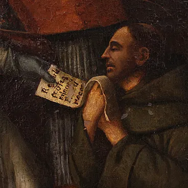 Grande dipinto spagnolo della seconda metà del XVII secolo. Opera olio su tela raffigurante soggetto religioso, Papa Innocenzo III conferma la Regola francescana, di buona mano pittorica. Quadro di grande misura e impatto adornato da cornice in legno e gesso, del XIX secolo, scolpita e dorata. Opera che si sviluppa in orizzontale, ideale da inserire in un importante salone o studio, per antiquari e arredatori. Dipinto che presenta diversi segni del tempo e di vecchi restauri (vedi foto), in bella patina. Piacevole la prospettiva offerta dal pittore. Il soggetto principale, in primo piano a sinistra si connette alla veduta con architetture e personaggi a destra tramite la pavimentazione a scacchiera (vedi foto), dal basso verso l’alto. Dipinto che ha subito un importante intervento di restauro conservativo, rintelo, sostituzione del telaio e ripresa del colore in diversi punti (vedi foto). In discrete condizioni con diversi segni del tempo, da restaurare. Luce dipinto H 159,5 x L 202,5 cm.