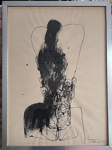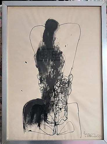 Disegno a china su carta di BEPI ROMAGNONI (Milano, 21 novembre 1930 – Villasimius, 19 luglio 1964) 70 x 50 - settembre 1957. E' stato un pittore italiano, esponente del movimento pittorico del realismo esistenziale. Biografia: Bepi Romagnoni, giovane artista milanese morto tragicamente in giovane età, è stato un esponente del movimento pittorico del Realismo Esistenziale che si ispirava alla filosofia di Kierkegaard, di Camus, di Sartre: si ritrova tale ispirazione nei temi scelti a soggetto delle sue opere - vuoto, l'incomunicabilità fra i personaggi, la solitudine e le differenze fra ceti sociali-, sia in quelle pittoriche che nei successivi collages. Fu sempre aggiornato nei confronti dell'arte contemporanea internazionale (come il gruppo Cobra e l'informale europeo) e si interessò anche alla pittura muralista messicana di José Clemente Orozco, cominciando a risentire nella sua produzione di forti accenti espressionistici, e poi, dalla fine degli anni '50 e inizi '60, delle influenze surrealiste, popolando la sua pittura di segni grafici e creando talvolta immagini fitomorfe e zoomorfe.